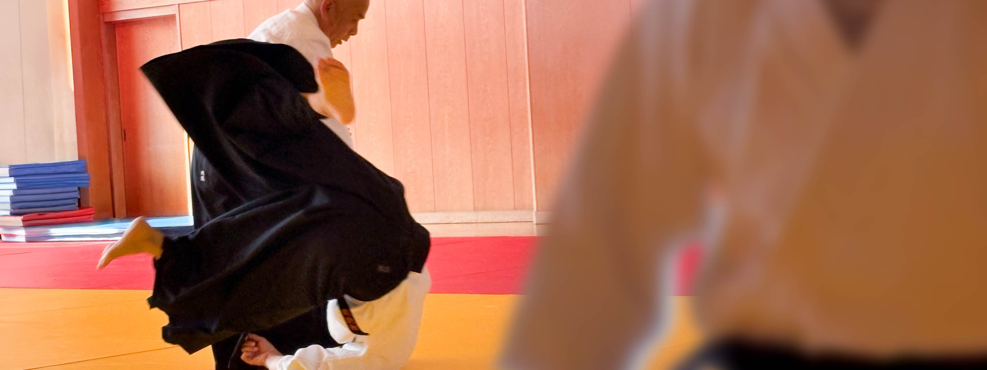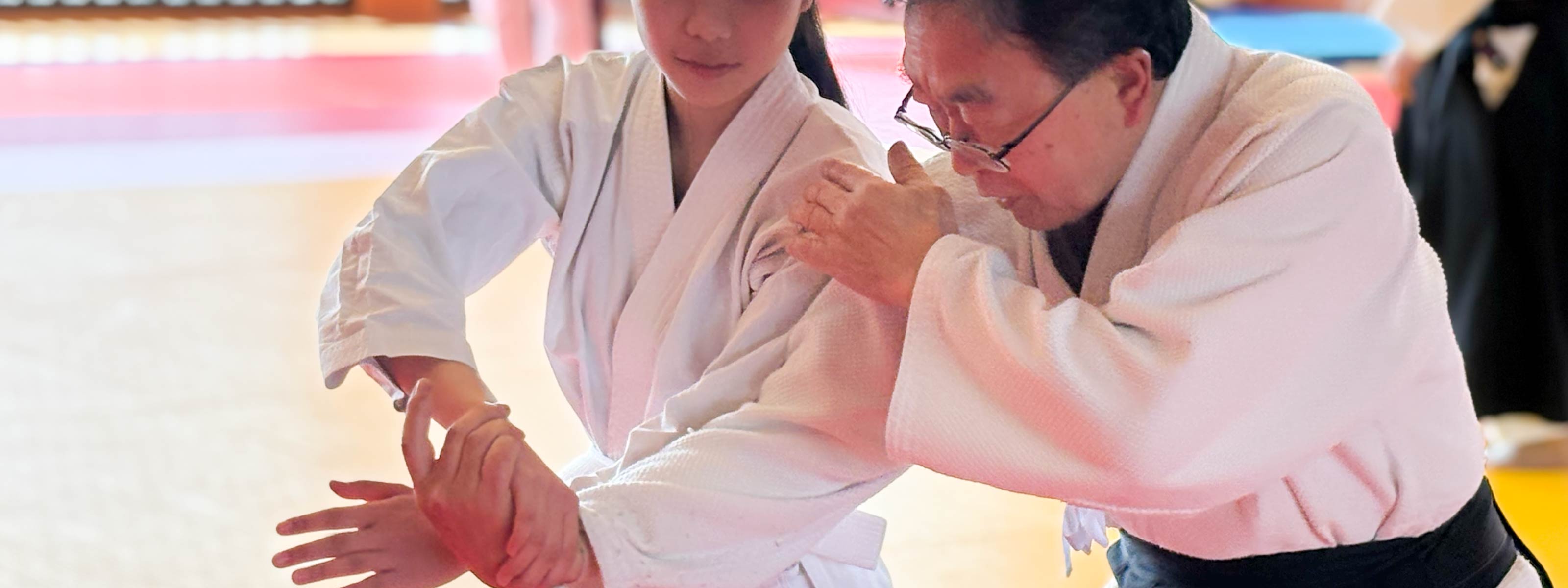 合気道は、開祖植芝盛平翁(1883~1969 )が日本伝統の武術の奥義を究め、さらに厳しい精神的修行を経て発展させた現代武道です。合気道は相手といたずらに力で争いません。入身と転換の体捌きから生まれる技は、相手の暴力を制するもので相手の生命を殺傷いたしません。